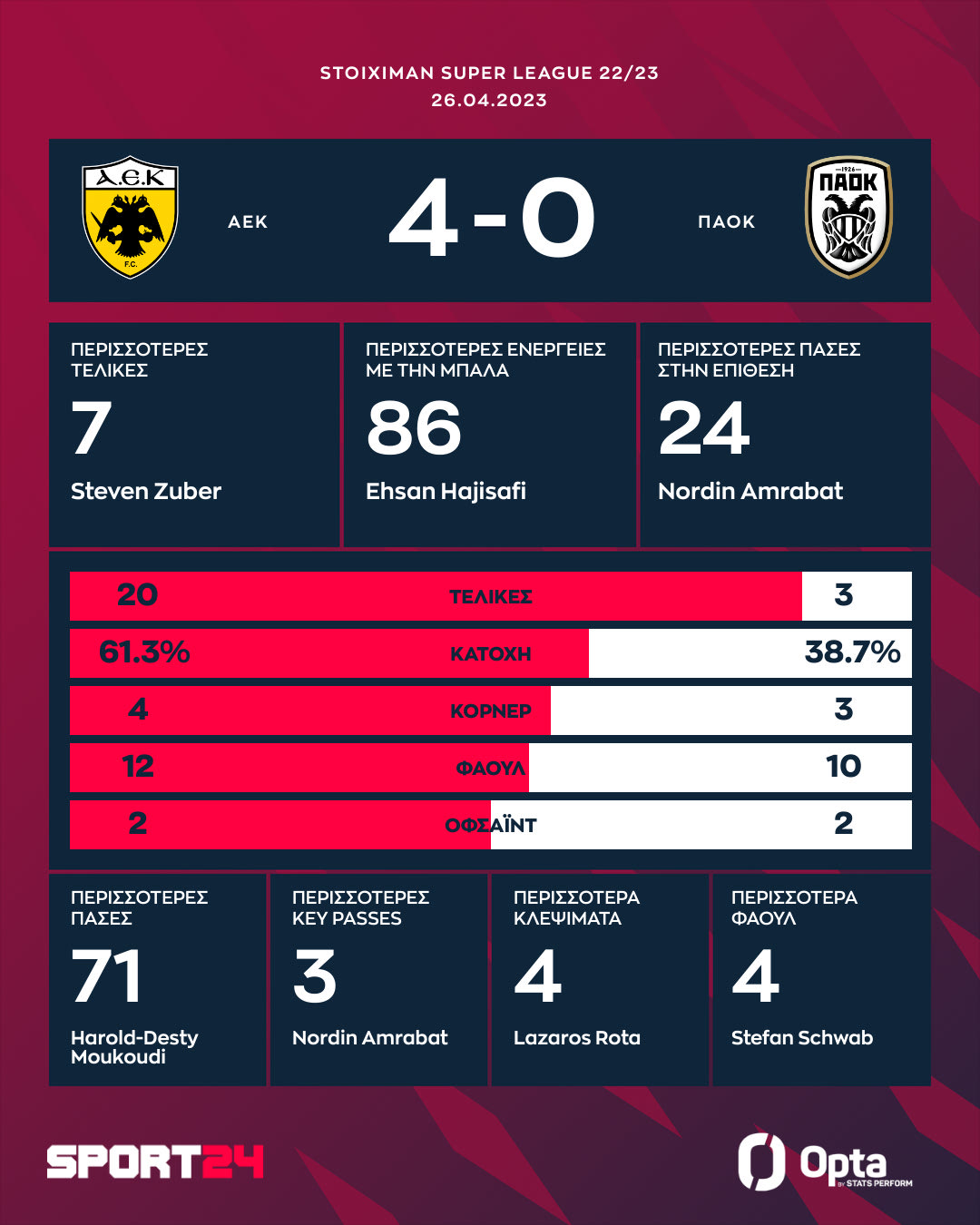 Η ΑΕΚ σκόρπισε τον ΠΑΟΚ στην OPAP Arena με τεσσάρα. Η Ένωση πέτυχε την πέμπτη διαδοχική νίκη της στα playoffs και πηγαίνει ισόβαθμη με τον Παναθηναϊκό στους 75 βαθμούς στον τελικό των τελικών στη Λεωφόρο. Τσούμπερ, Μουκουντί, Γκαρσία και Φερνάντες οι σκόρερ της Ένωσης, δύο ασίστ μοίρασε ο Γιόνσον, ενώ οι Θεσσαλονικείς έπαιζαν με δέκα παίκτες από το 10' λόγω της αποβολής του Κάργα.