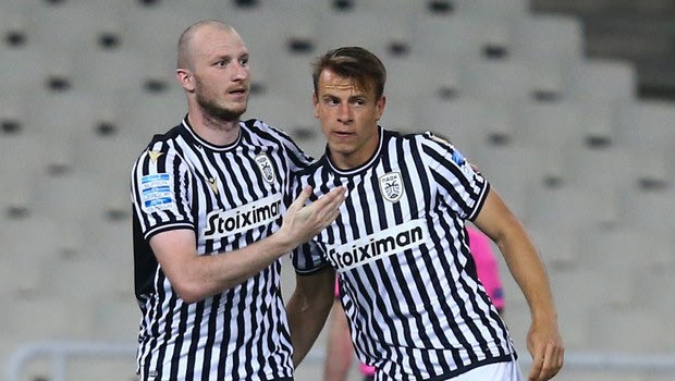 Κρμέντσικ και Σβαμπ πανηγυρίζουν τα γκολ του ΠΑΟΚ επί της ΑΕΚ στα playoffs /5-5-2021