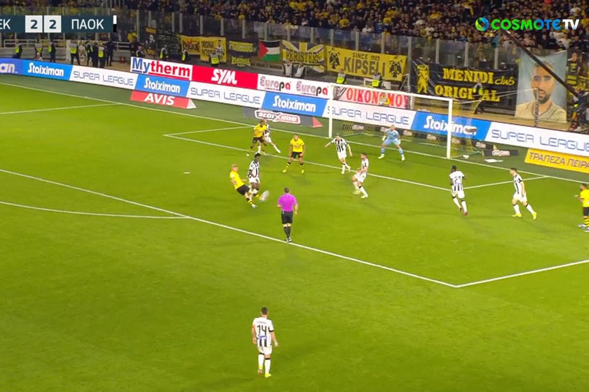 Η ΑΕΚ πλησίασε στο 3-2 απέναντι στον ΠΑΟΚ στο 90+8', με τον Γενς Γιόνσον να κάνει το σουτ με τη μία, αλλά να περνάει λίγο πάνω από την εστία του Κοτάρσκι.