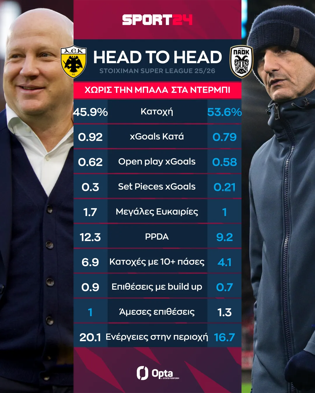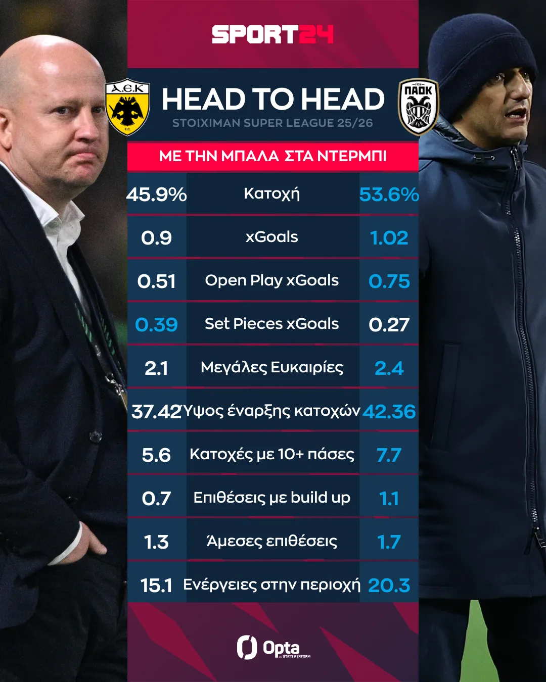 Η ομάδα του Ραζβάν Λουτσέσκου απειλεί πιο εύκολα στο open play (0.75 αντί για 0.51 της ΑΕΚ), ενώ οι παίκτες του Μάρκο Νίκολιτς είναι πιο δυνατοί στις στατικές φάσεις (0.39 xGoals υπέρ αντί για το 0.27 του ΠΑΟΚ).