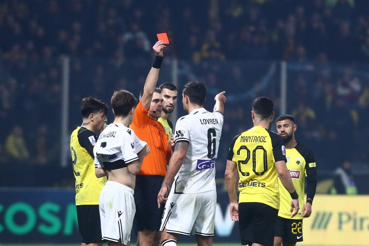 Με 10 παίκτες ολοκλήρωσε ο ΠΑΟΚ το ντέρμπι με την ΑΕΚ για τον πρώτο αγώνα της προημιτελικής φάσης του Κυπέλλου Ελλάδας Betsson, καθώς ο Ντέγιαν Λόβρεν δέχθηκε την κόκκινη κάρτα στο 90+2′.
