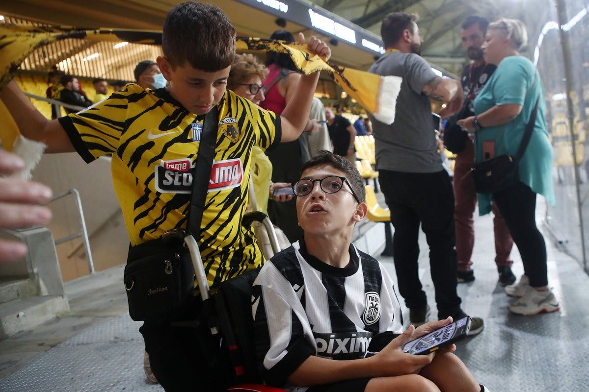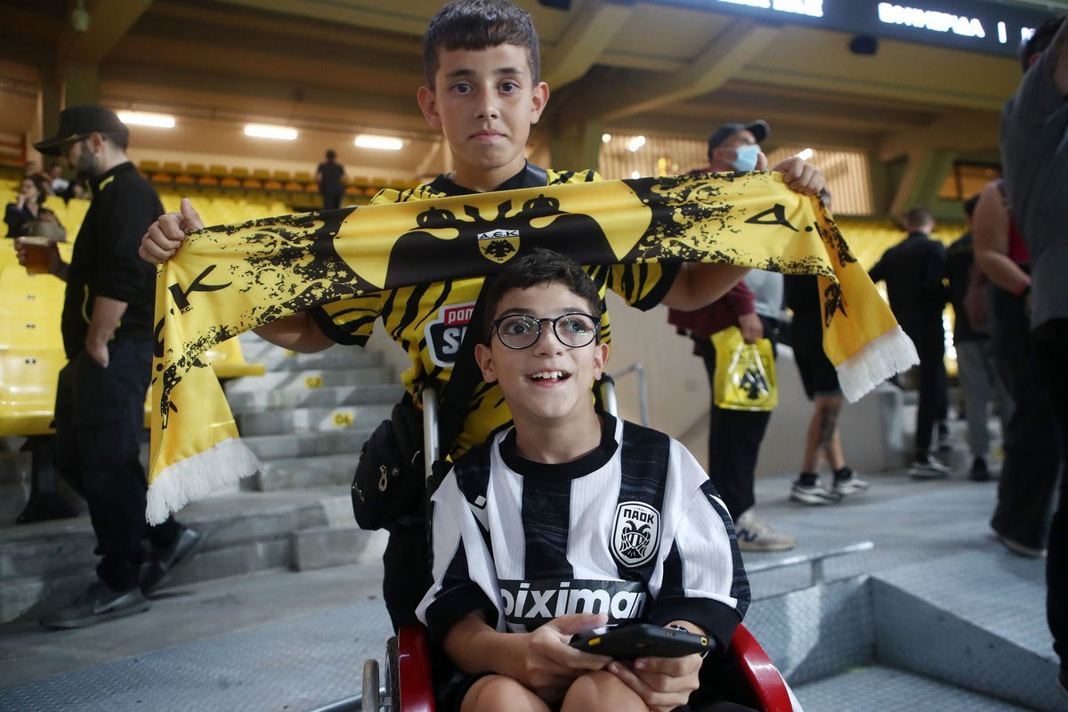 Ο μικρός με τη φανέλα του ΠΑΟΚ όπως και στον τελικό Κυπέλλου και ο αδερφός του με φανέλα της ΑΕΚ.