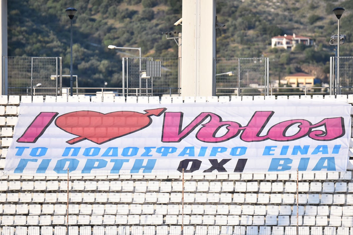 Οι διοργανωτές άπλωσαν στις άδειες κερκίδες του Πανθεσσαλικού Σταδίου ένα πανό, το οποίο έγραφε: “I love Volos, το ποδόσφαιρο είναι γιορτή, όχι βία”.