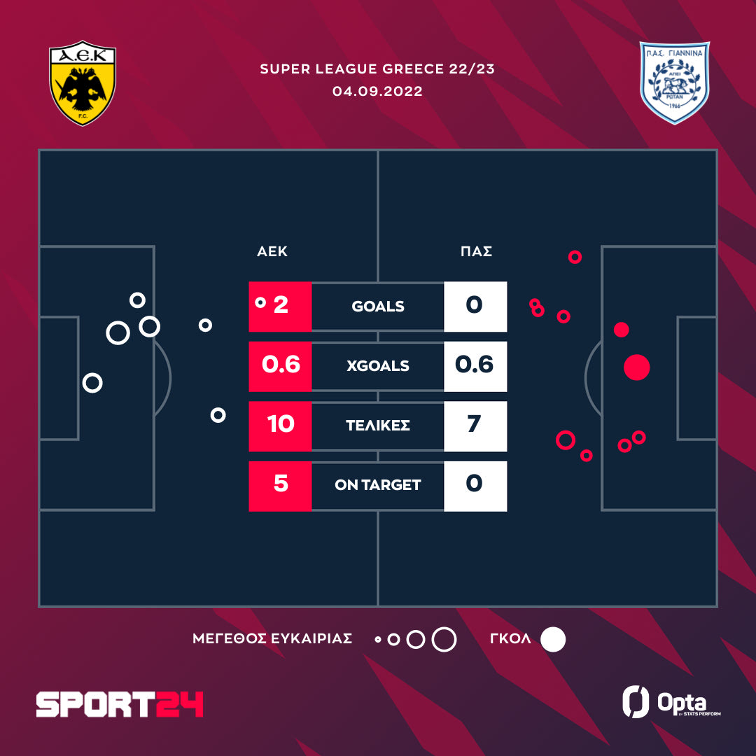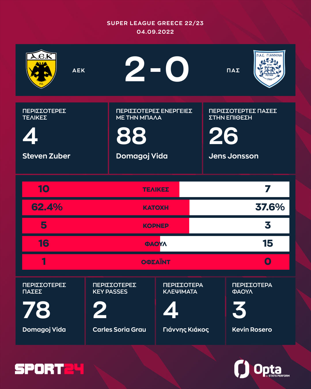 Η ΑΕΚ έδωσε το τελευταίο της παιχνίδι μακριά από την OPAP Arena, επικρατώντας του ΠΑΣ Γιάννινα με 2-0 στη Ριζούπολη και επέστρεψε στις νίκες στη Super League. Οι πρωταγωνιστές για την ομάδα του Ματίας Αλμέιδα ήταν ο Ορμπελίν Πινέδα στο 39′ και ο Νορντίν Άμραμπατ στο 87′.