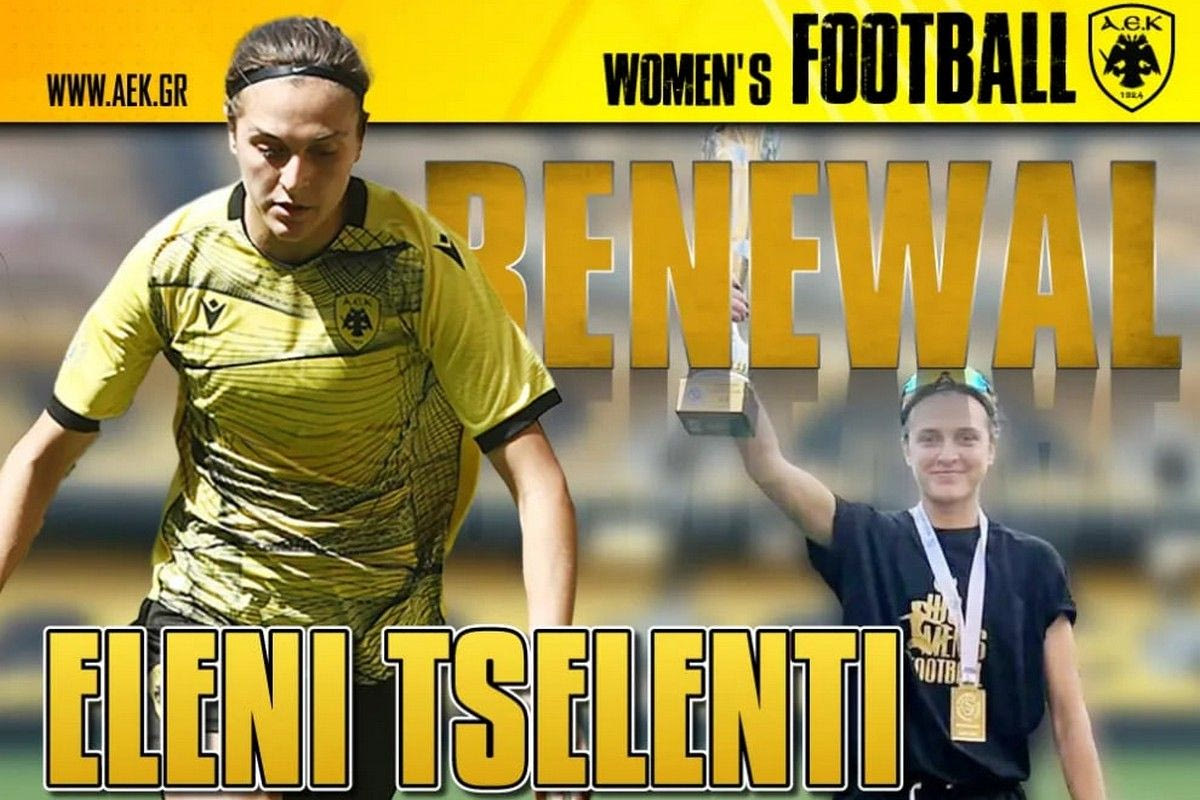 “Η ΑΕΚ βρίσκεται στην ευχάριστη θέση να ανακοινώσει την ανανέωση της συνεργασίας της με την Ελένη Τσελέντη. Η 21χρονη (29/03/2004) αθλήτρια υπέγραψε το νέο της συμβόλαιο και θα παραμείνει στο δυναμικό της γυναικείας ομάδας Ποδοσφαίρου του Συλλόγου.