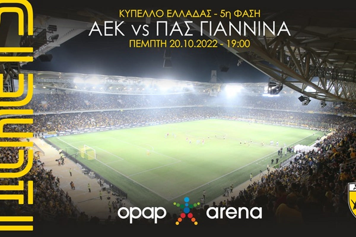 Η ΠΑΕ ΑΕΚ ανακοίνωσε ότι τέθηκαν σε κυκλοφορία τα εισιτήρια για το παιχνίδι Κυπέλλου με τον ΠΑΣ Γιάννινα στην OPAP Arena. Τα εισιτήρια διατίθενται μόνο ηλεκτρονικά, ενώ οι τιμές τους εκκινούν από 20 ευρώ.