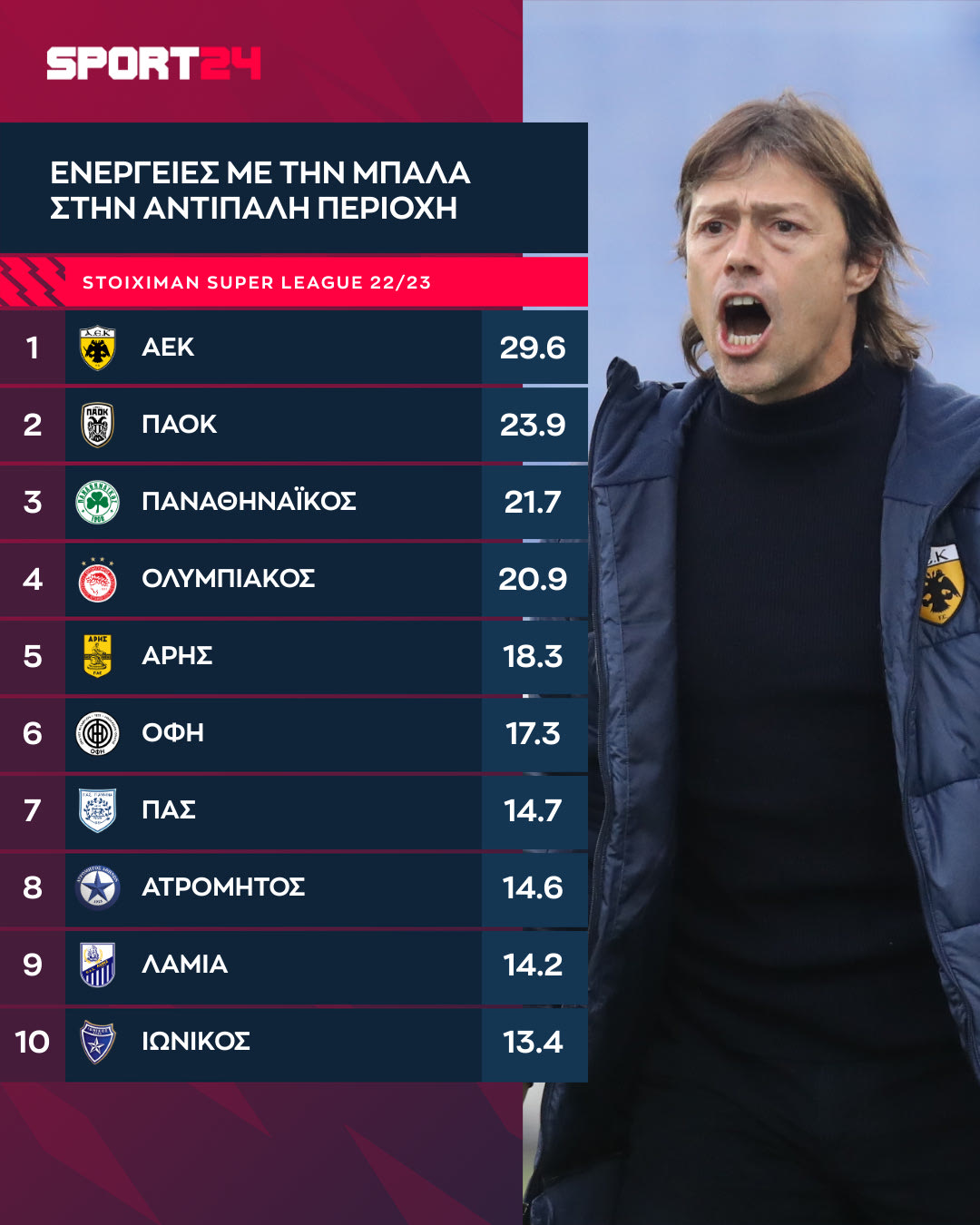 Η ΑΕΚ είχε κατά μέσο όρο 29.6 ενέργειες στην αντίπαλη περιοχή. Φοβερή επίδοση αν σκεφτεί κανείς πως καμία από τις υπόλοιπες ομάδες δεν έχει ξεπεράσει τις 24, ούτε φέτος, ούτε σε κάποιο από τα τρία προηγούμενα πρωταθλήματα.