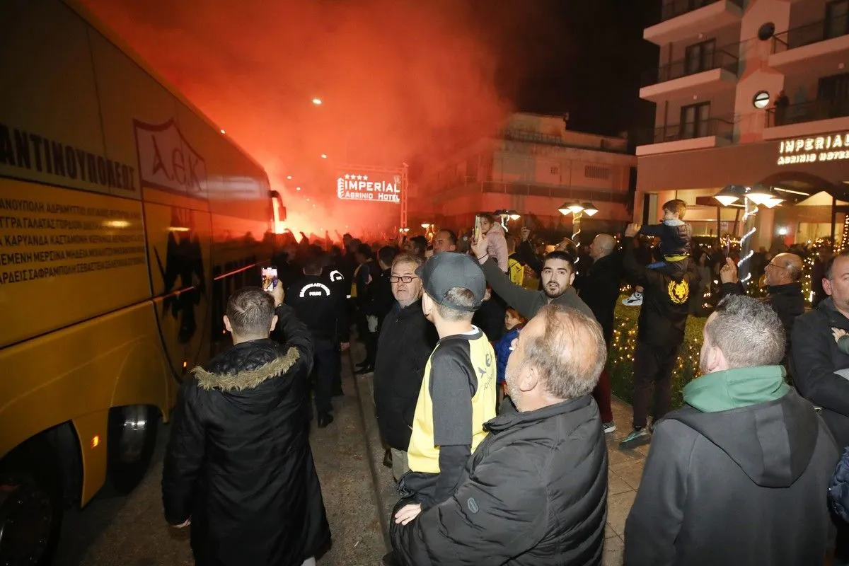 Φίλοι της ΑΕΚ κάθε ηλικίας βρέθηκε έξω από το ξενοδοχείο και δημιούργησε φανταστική ατμόσφαιρα, θέλοντας να εμψυχώσουν τους ποδοσφαιριστές της ομάδας τους.