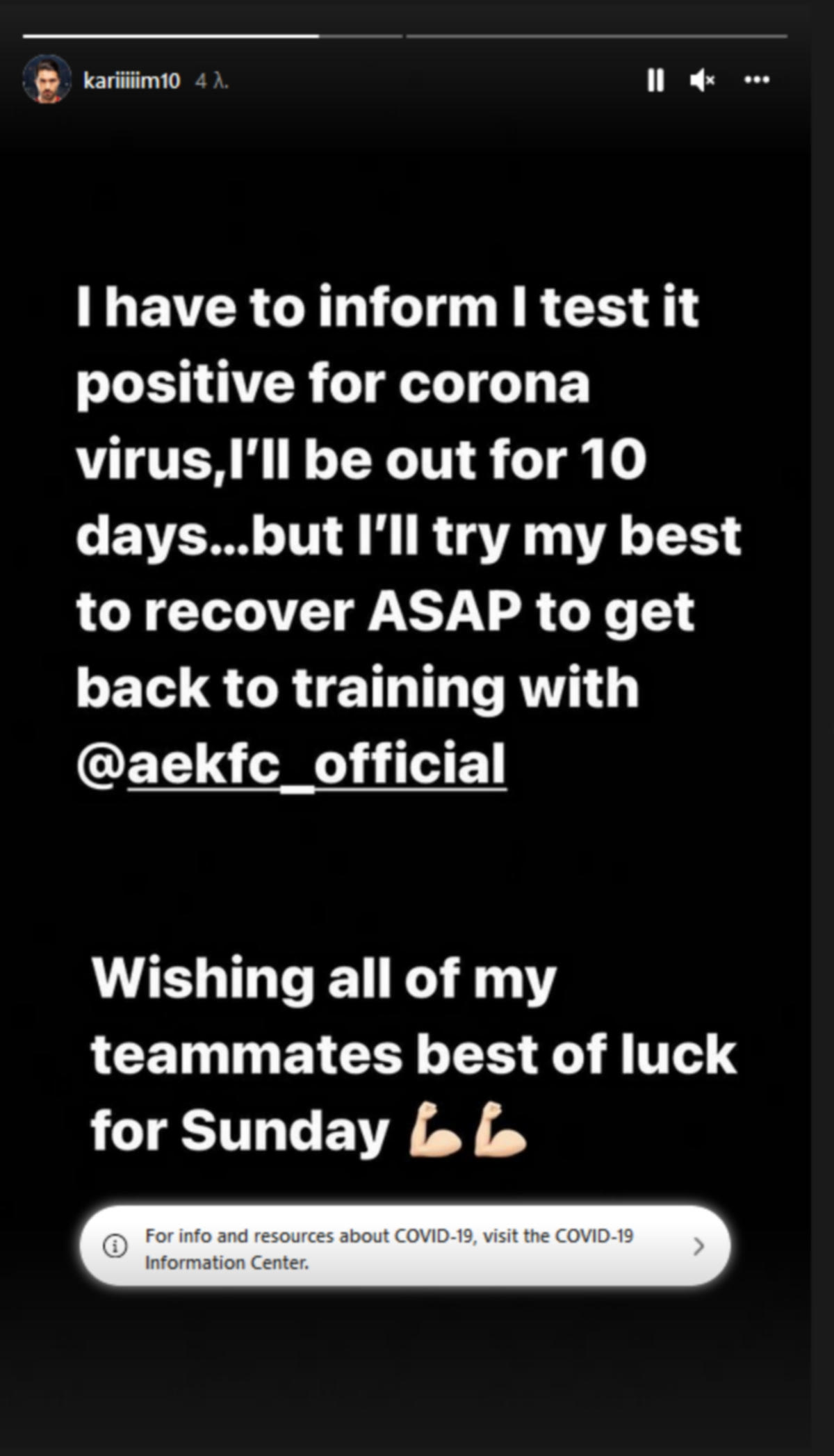 “Θέλω να σας ενημερώσω πως βρέθηκα θετικός στον κορονοϊό, θα είμαι εκτός δράσης για δέκα μέρες. Αλλά θα κάνω το καλύτερο δυνατό για να γίνω γρήγορα καλά και να επιστρέψω.