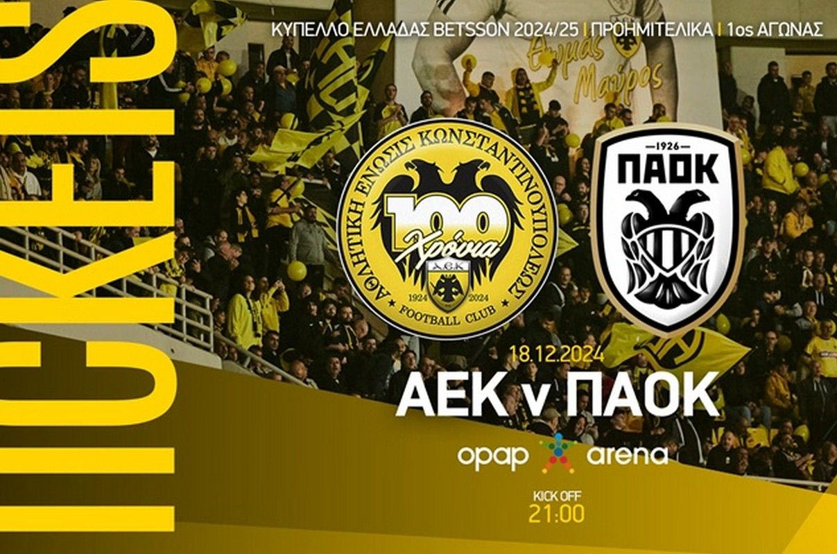 “Η ΠΑΕ ΑΕΚ ανακοινώνει ότι τη Δευτέρα 9 Δεκεμβρίου στις 16.00 θα αρχίσει η διάθεση των εισιτηρίων για το 1ο παιχνίδι της προημιτελικής φάσης του Κυπέλλου Ελλάδας απέναντι στο ΠΑΟΚ, το οποίο θα διεξαχθεί την Τετάρτη 18 Δεκέμβριου στις 21.00, στην OPAP Arena.