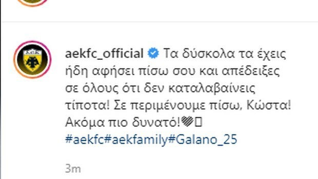 Ο Κώστας Γαλανόπουλος στάθηκε άτυχος καθώς θα μείνει εκτός δράσης για τουλάχιστον δύο μήνες ελέω του τραυματισμού του κόντρα στον Απόλλωνα, με την ΑΕΚ να φροντίζει πάντως να του ανεβάζει το ηθικό μέσω μηνύματος στη σελίδα της στο Instagram.
