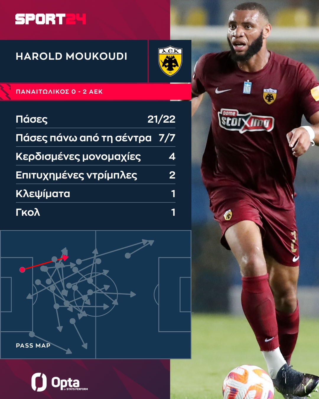 Ο Αρόλντ Μουκουντί παρουσίασε πολύ θετική εικόνα στο ντεμπούτο του με την ΑΕΚ και ο Ηλίας Καλλονάς παρουσιάζει τα στοιχεία που τον έκαναν να ξεχωρίσει με το παιχνίδι του.