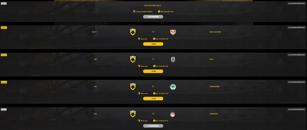Εάν μπει κάποιος στη σελίδα της ΠΑΕ ΑΕΚ και προσπαθήσει να κλείσει εισιτήρια θα δει ότι δεν υπάρχουν διαθέσιμα, κάτι που δεν ισχύει για τα ματς με τη Ράγιο Βαγιεκάνο, τον ΠΑΟΚ και τον Παναθηναϊκό, στα οποία μπορεί κάποιος να προμηθευτεί “μαγικό χαρτάκι”.
