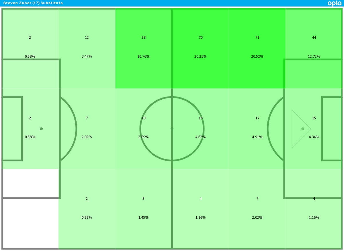 Βέβαια, όπως φαίνεται και στο γράφημα της Opta/Stats Perform που αποτυπώνει το χώρο δράσης του, ο Μάνταλος, πέρα από τον άξονα, κινείται και προς τα αριστερά, λειτουργώντας ως ιδανικό συμπλήρωμα του Στίβεν Τσούμπερ.