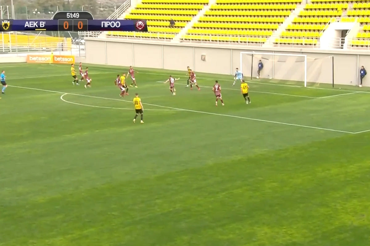 Το απίστευτο τσαφ του Πάβλα στην προσπάθεια του να διώξει νίκησε τον Καραργύρη στο 52' της αναμέτρησης ΑΕΚ Β' - Προοδευτική και έδωσε προβάδισμα στην Ένωση.