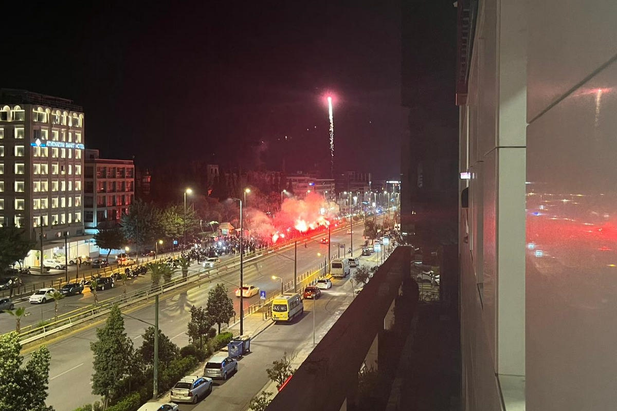 Οι φίλοι της ΑΕΚ είχαν αρχίσει να συγκεντρώνονται αρκετή ώρα νωρίτερα με αποτέλεσμα να προκαλέσουν κυκλοφοριακή συμφόρηση στην Συγγρού.