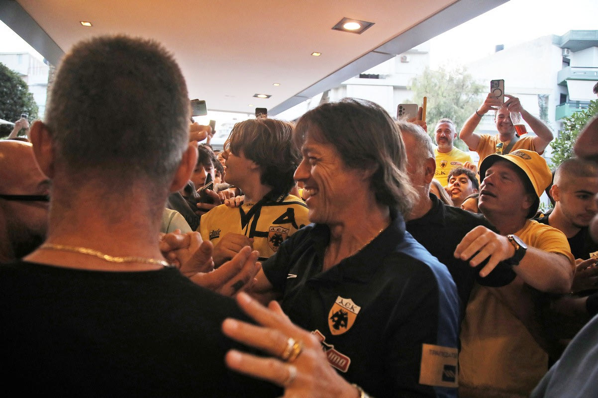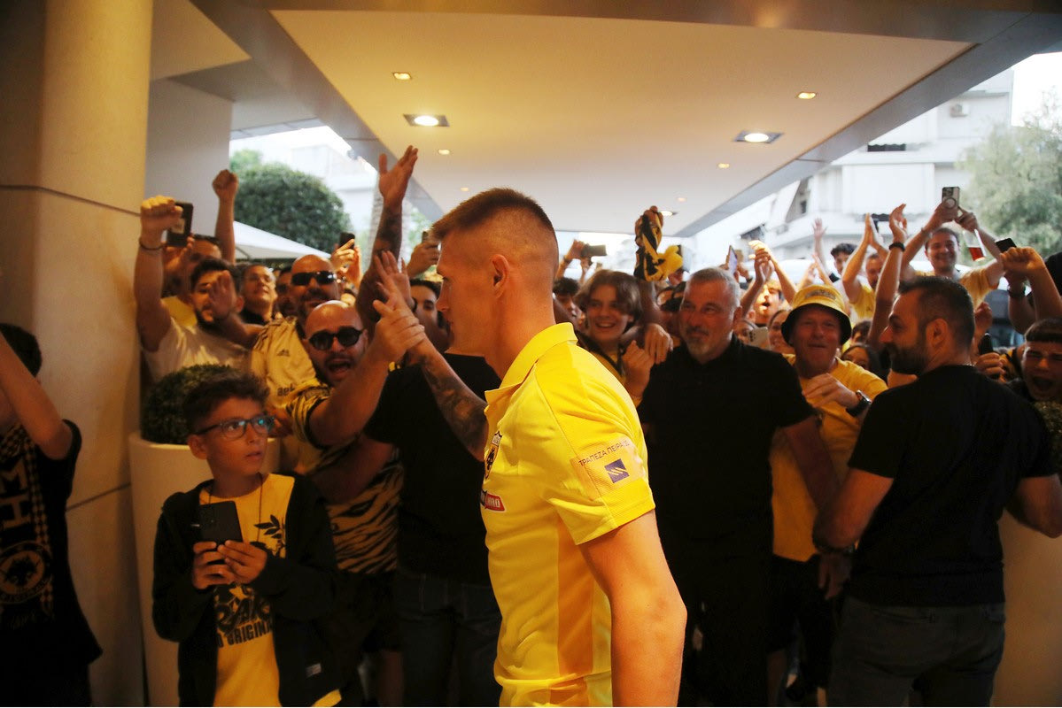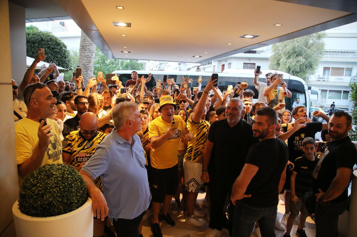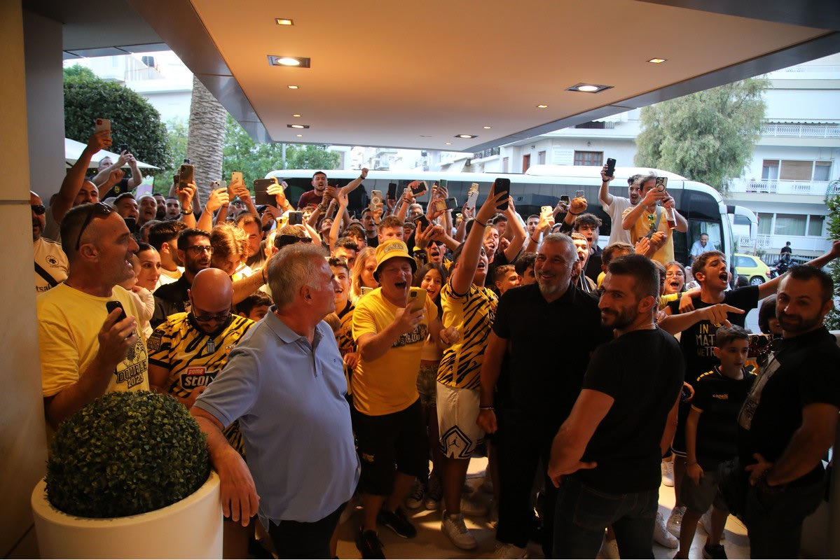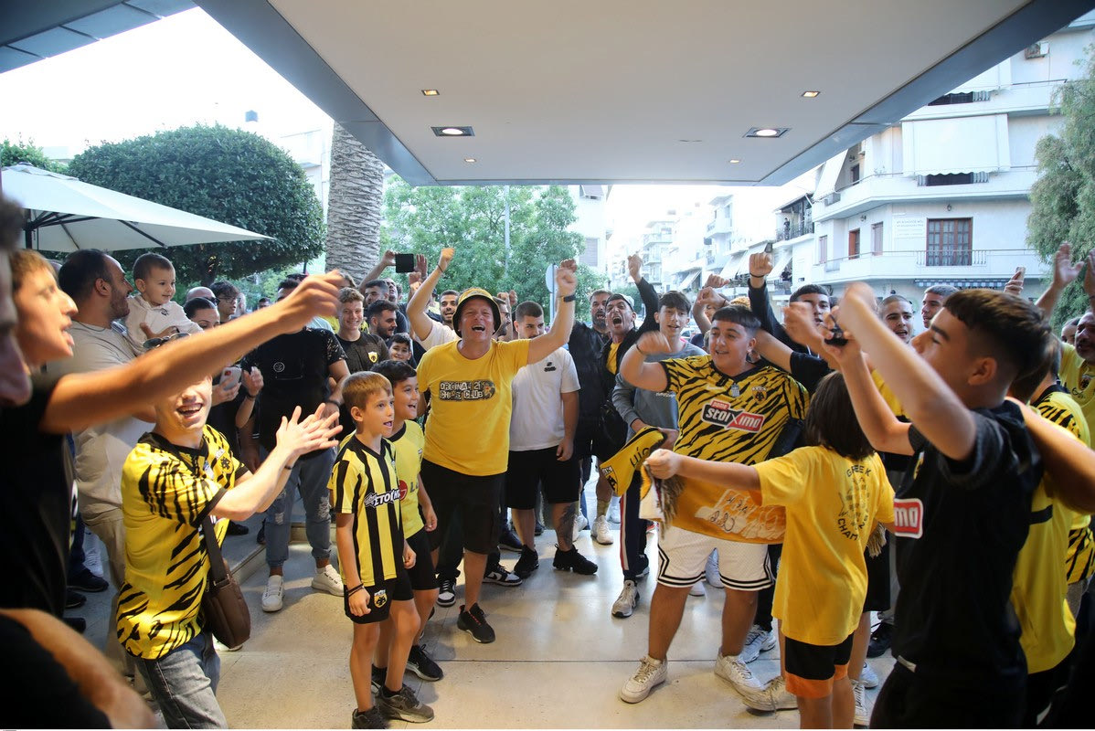 Οι οπαδοί της ΑΕΚ πήγαν στο ξενοδοχείο που κατέλυσε η αποστολή της ομάδας του Ματίας Αλμέιδα και τους αποθέωσαν μέσα σε ένα πανηγυρικό κλίμα.