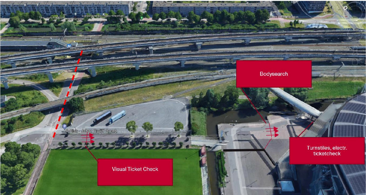 Από τον σταθμό του μετρό Strandvliet ArenA station, οι φίλοι της ΑΕΚ μπορούν να ξεκινήσουν την διαδικασία εισόδου στο γήπεδο. Πρώτα θα υπάρξει οπτικός έλεγχος των εισιτηρίων και μετά από αυτό θα ακολουθήσει σωματικός έλεγχος και στην τελική φάση θα υπάρξει ηλεκτρονικός έλεγχος στα τουρνικέ. Εκεί θα υπάρχουν σκύλοι εκπαιδευμένοι στην ανίχνευση ναρκωτικών, όπως και αντίστοιχοι εκπαιδευμένοι στην ανίχνευση pyrotechnics.