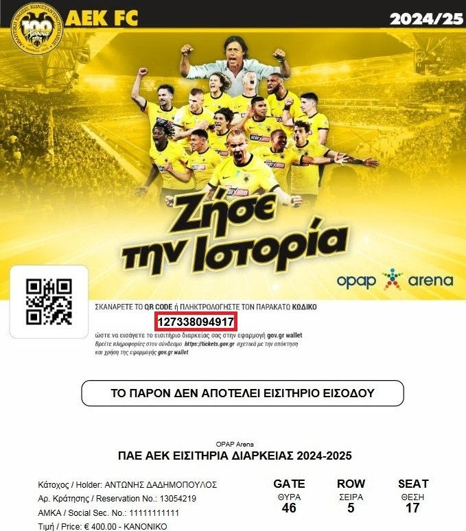 Τονίζουμε πως είναι σε ισχύ τα νέα μέτρα για τη διαδικασία εισόδου στις αθλητικές εγκαταστάσεις και αυτή γίνεται αποκλειστικά με χρήση της εφαρμογής gov.gr wallet και υπενθυμίζουμε πως η ΠΑΕ δεν φέρει καμία ευθύνη για την μη επιτυχημένη λήψη του εισιτηρίου στην εφαρμογή.