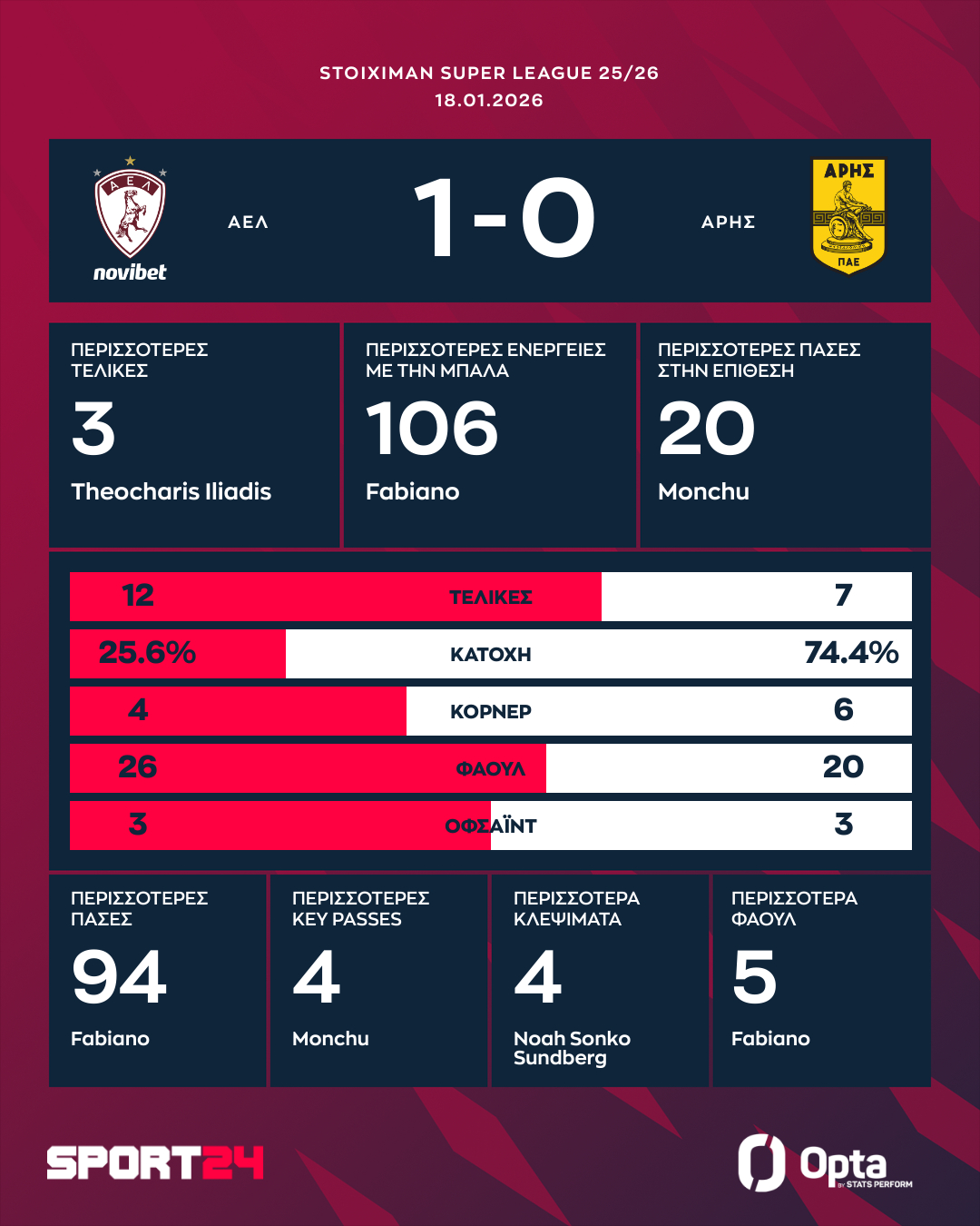 Ο Άρης από την άλλη μεριά έμεινε στην 7η θέση με 21 βαθμούς, μένοντας για τρίτο διαδοχικό ματς χωρίς νίκη.