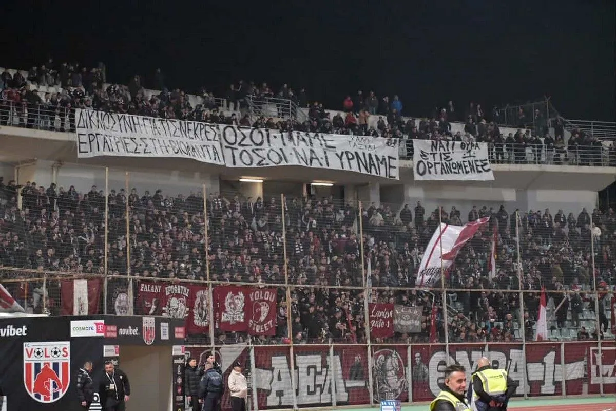 Οι φίλοι της ομάδας της ΑΕΛ Novibet ύψωσαν πανό για τις δύο τραγωδίες που συγκλόνησαν το πανέλληνιο. Η μια στο εργοστάσιο της Βιολάντα που πέντε εργάτριες έχασαν τη ζωή τους λόγω έκρηξης από διαρροή προπανίου και η άλλη μια ημέρα μετά που επτά φίλοι του ΠΑΟΚ έχασαν τη ζωή τους σε τροχαίο δυστύχημα στη Ρουμανία.