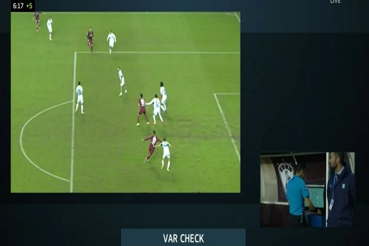Όμως, ο διαιτητής VAR, Κουμπαράκης, τον κάλεσε να ξαναδεί τη φάση, με τον κ. Ευαγγέλου να καταλογίζει την εσχάτη των ποινών μετά από on-field review, αποβάλλοντας τον Μλαντένοβιτς με δεύτερη κίτρινη κάρτα.