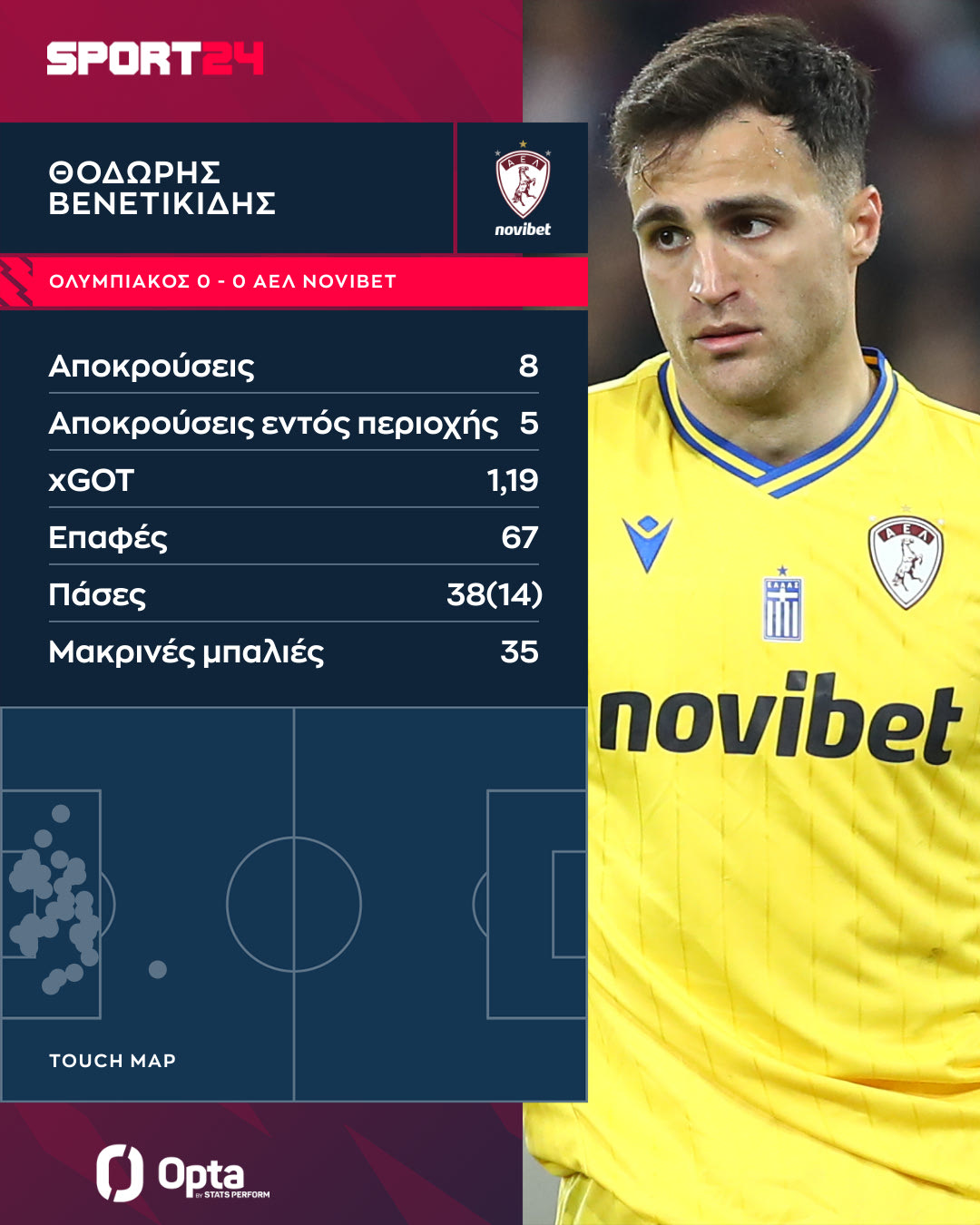 Ο Βενετικίδης ολοκλήρωσε το ματς με οκτώ αποκρούσεις, που είναι η τέταρτη καλύτερη επίδοση στο φετινό πρωτάθλημα. Μάλιστα, οι πέντε επεμβάσεις ήταν σε σουτ μέσα από τη “βυσσινί” περιοχή, κάτι που αυξάνει τη δυσκολία τους.