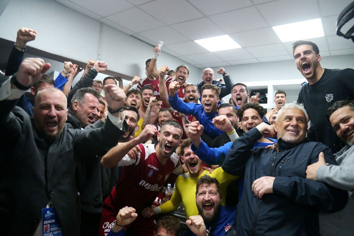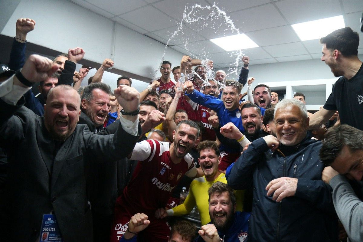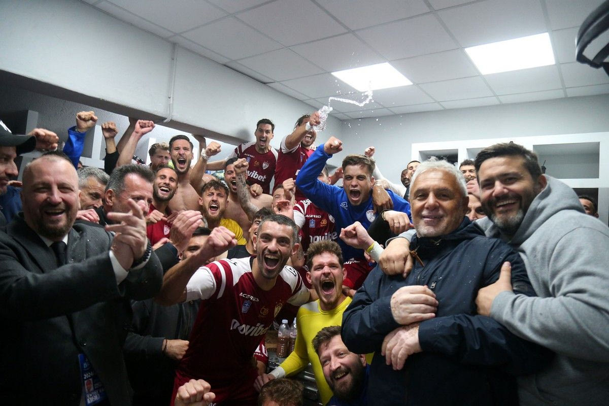 Λίγο αργότερα, όλοι βρέθηκαν στα αποδυτήρια, όπου παίκτες, τεχνικό επιτελείο και διοίκηση έγιναν ένα, πανηγυρίζοντας την άνοδο στα σαλόνια του ελληνικού ποδοσφαίρου.