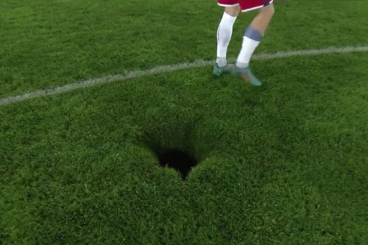 Μια μεγάλη τρύπα άνοιξε κοντά στη μεσαία γραμμή, οι οποίοι προκάλεσε σοκ στους ποδοσφαιριστές, οι οποίοι ενημέρωσαν τους διαιτητές και τους παρατηρητές του αγώνα.