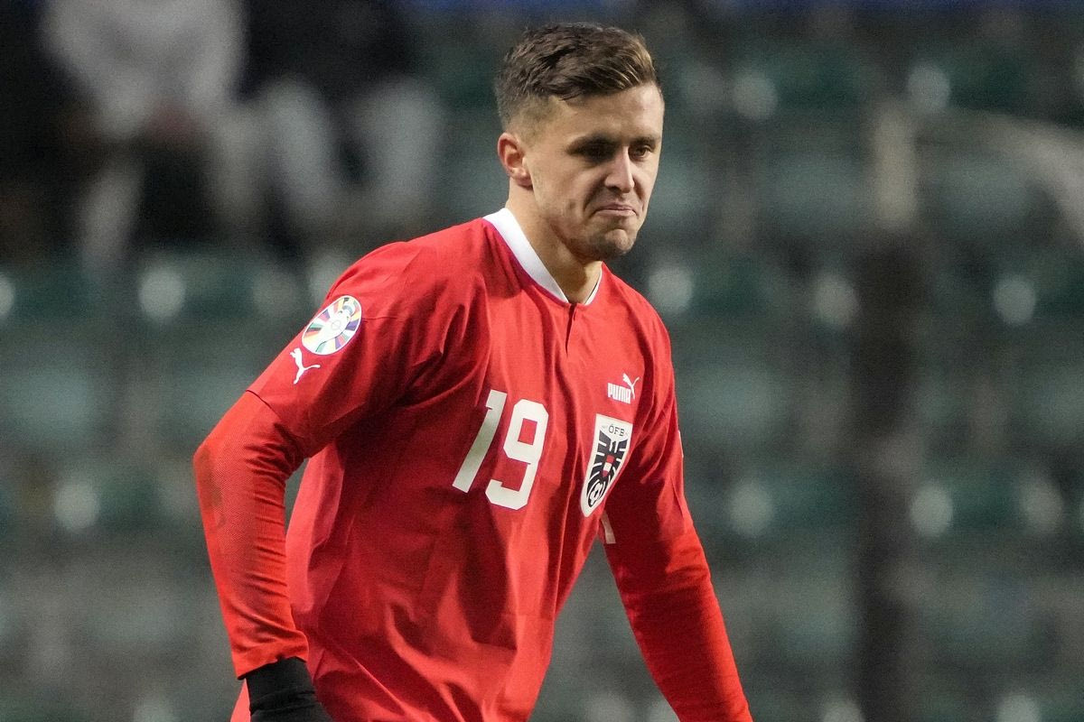 Austria's Christoph Baumgartner during the Euro 2024 group F qualifying soccer match between Estonia and Austria at the A. Le Coq Arena in Tallinn, Estonia, Thursday, Nov. 16, 2023. (AP Photo/Sergei Grits)