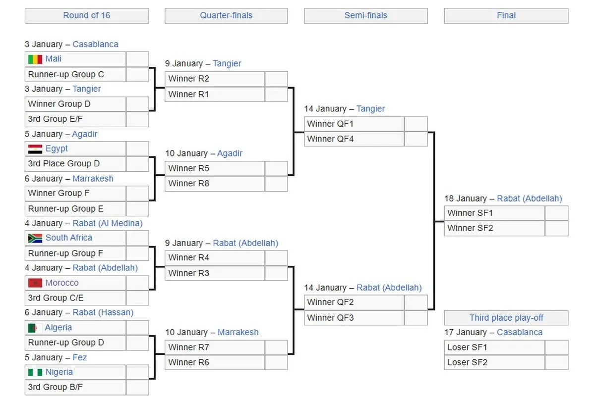 Στους 16, η ομάδα του Ουαλίντ Ρεγκραγκί θα αντιμετωπίσει έναν τρίτο από τους ομίλους C, D ή Ε, στις 4 Ιανουαρίου. Φυσικά, το γεγονός ότι το Μαρόκο προκρίθηκε από τη φάση των ομίλων, σημαίνει αυτόματα ότι ο Ελ Κααμπί θα απουσιάσει από το Betsson Super Cup και τον αγώνα του Ολυμπιακού κόντρα στον ΟΦΗ στις 3 Ιανουαρίου.