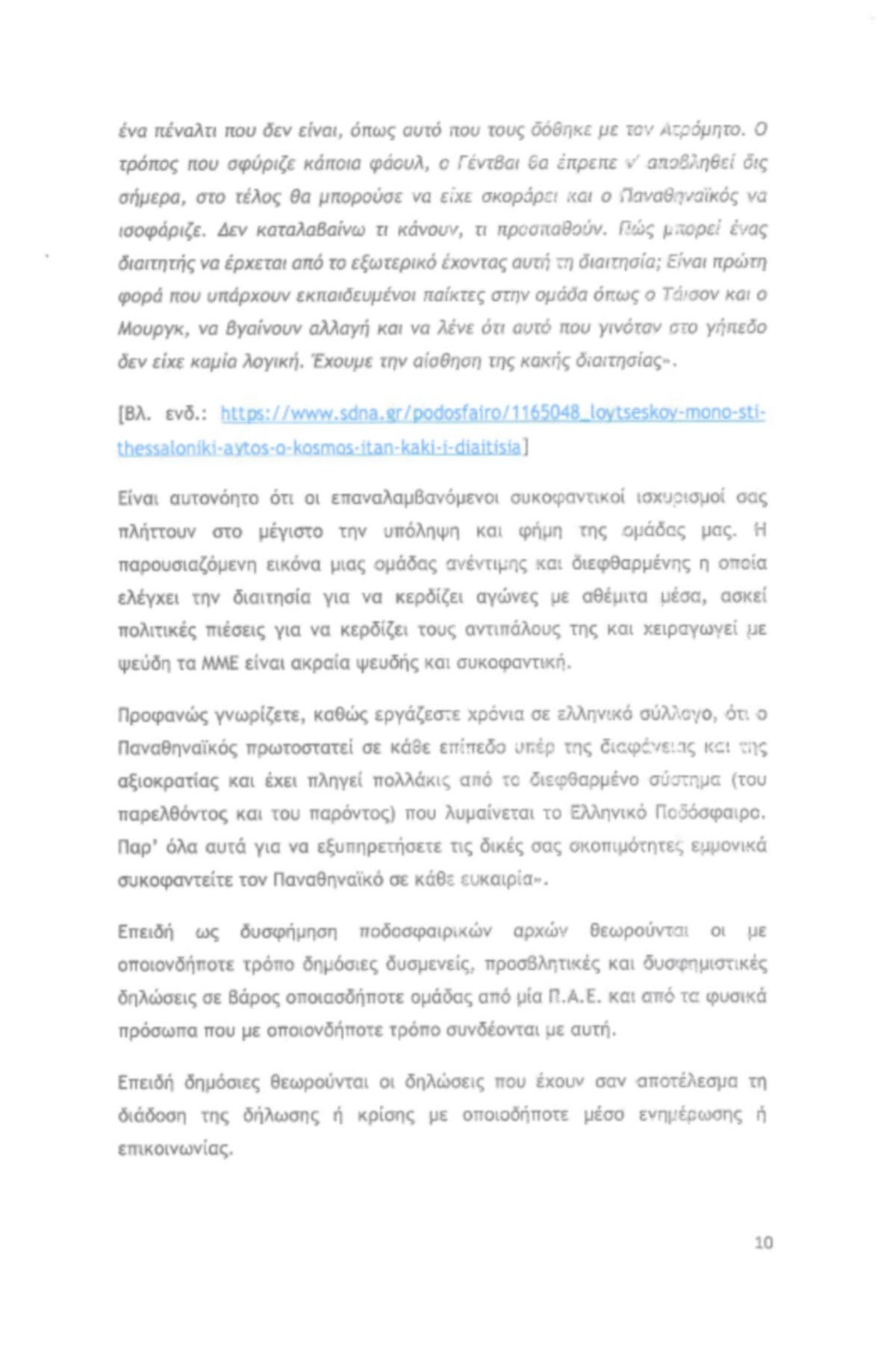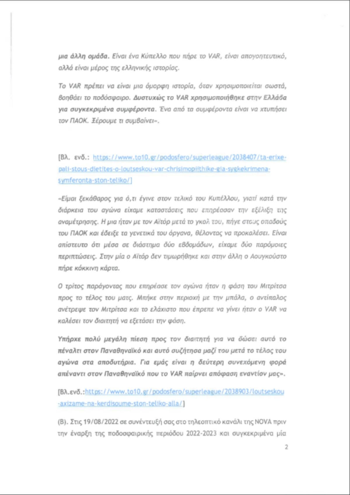 Το πρωί της Πέμπτης (1/2) ο Παναθηναϊκός απέστειλε ένα εξώδικο προς τον Λουτσέσκου με το οποίο ζητάει από τον Ρουμάνο τεχνικό να ανακαλέσει κάποιες από τις δηλώσεις του.