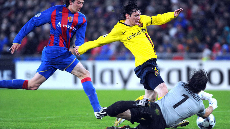 Ο Κοστάνσο μπλοκάρει τη μπάλα μπροστά στον Μέσι (Βασιλεία – Μπαρτσελόνα, Τσάμπιονς Λιγκ 2008-09)