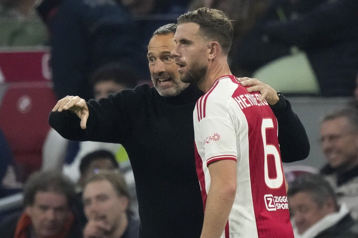 Ajax's manager John van 't Schip, left, gives instructions to Jordan Henderson during the Dutch Eredivisie soccer match between Ajax and PSV at ArenA stadium Amsterdam, Netherlands, Saturday, Feb. 3, 2024. (AP Photo/Peter Dejong) AP Photo / Peter Dejong
