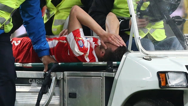 Ο αρχηγός του Ολυμπιακού καθισμένος σε καροτσάκι και με μπαταρισμένο το γόνατο του επιβιβάστηκε με την βοήθεια των γιατρών στο ασθενοφόρο, όπως και ο Ντουρμάζ ο οποίος υποβασταζόταν από τους ανθρώπους του Ολυμπιακού.