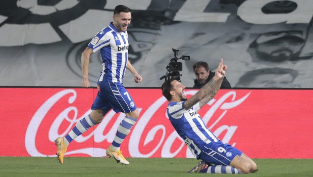 Ο Χοσέλου της Αλαβές πανηγυρίζει το τέρμα που πέτυχε κόντρα στην Ρεάλ 2020 AP Photo/Bernat Armangue