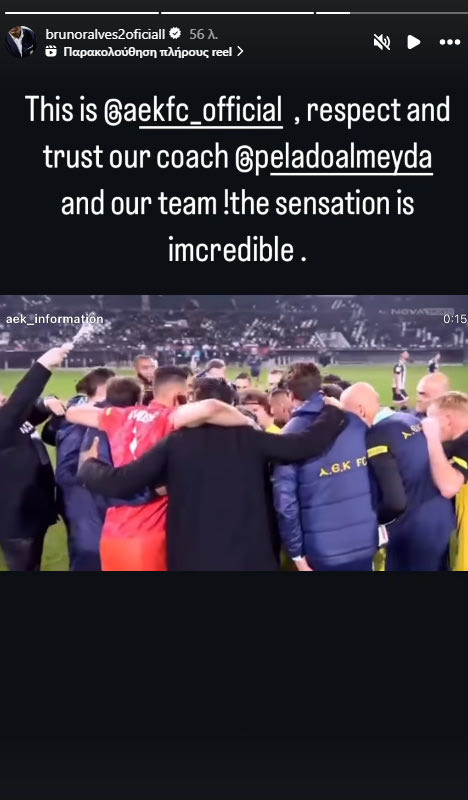 “Αυτή είναι η ΑΕΚ, σεβασμός και εμπιστοσύνη στον Αλμέιδα και την ομάδα μας. Η αίσθηση είναι απίστευτη“, έγραψε ο Πορτογάλος πρώην αμυντικός της Ένωσης σε story του στο Instagram.