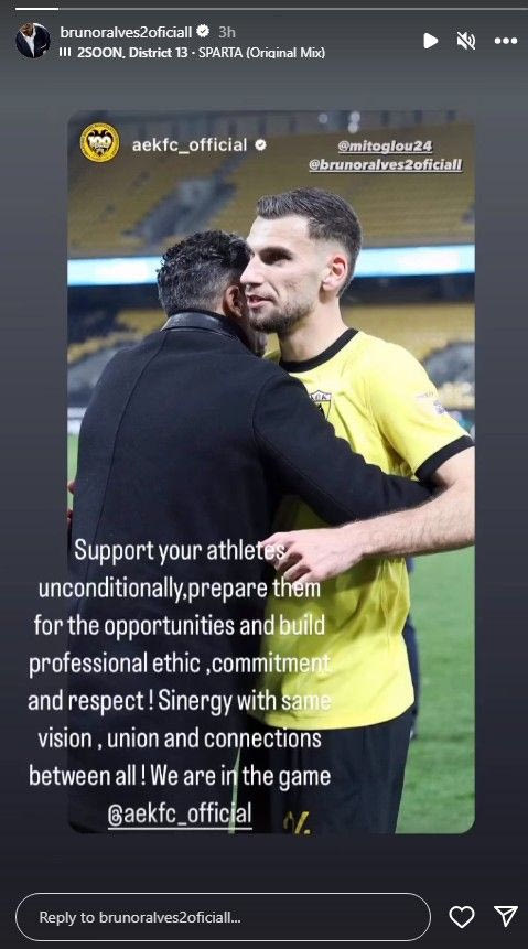 Ο Μπρούνο Άλβες με ένα story στο Instagram, στο οποίο αναδημοσίευσε story της ΑΕΚ που ο ίδιος δίνει μια αγκαλιά με τον Σίμο Μήτογλου, με τον οποίο διατηρεί μια εξαιρετική σχέση και του δίνει συμβουλές διαρκώς, μιας και έπαιζε στην ίδια θέση μαζί του.