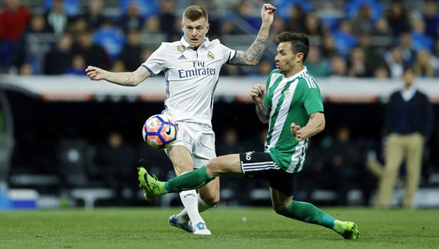 Real Madrid's Toni Kroos, left, tussles for the ball with Real Betis' Alin Tosca during a Spanish La Liga soccer match between Real Madrid and Real Betis at the Santiago Bernabeu stadium in Madrid, Sunday, March 12, 2017. (AP Photo/Francisco Seco)