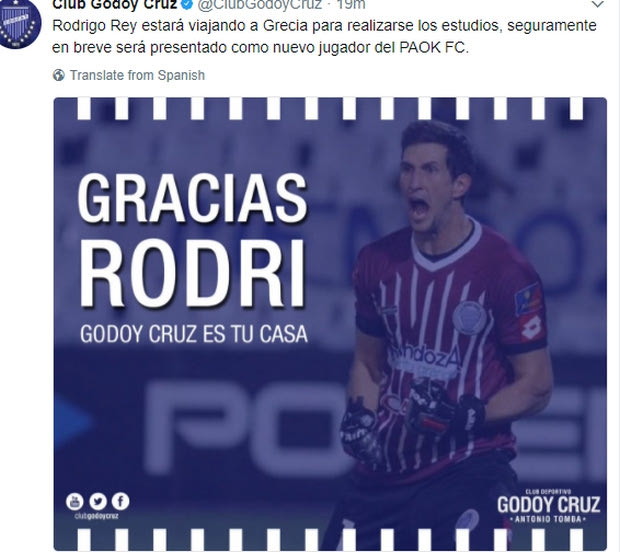 Με μια φωτογραφία στα social media, η “τόμπα” ευχαριστεί τον Ρέι για την παρουσία του στην ομάδα της Μεντόσα ενώ παράλληλα γνωστοποιεί ότι θα ταξιδέψει στην Ελλάδα για να υποβληθεί σε ιατρικές εξετάσεις και να ολοκληρώσει τη μετακίνησή του από την “τόμπα” στον ΠΑΟΚ.