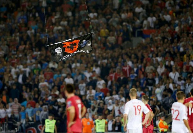 Οι παίκτες της Αλβανίας εγκατέλειψαν τον αγωνιστικό χώρο και αρνήθηκαν να επιστρέψουν μετά από επίθεση που δέχτηκαν από εξαγριωμένους οπαδούς της Σερβίας, που μπήκαν στον αγωνιστικό χώρο και χτυπούσαν Αλβανούς παίκτες.