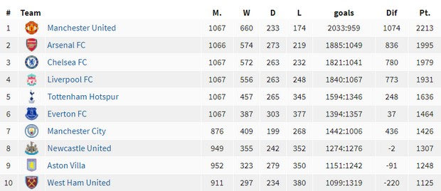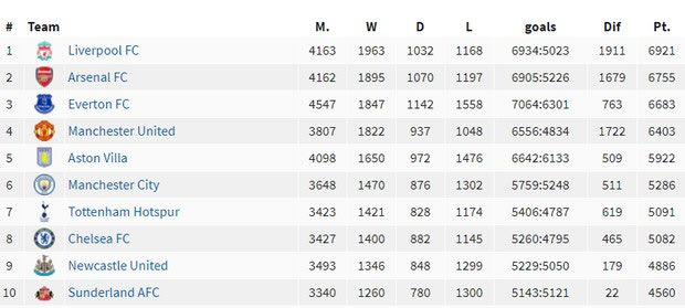 Η Λίβερπουλ ετοιμάζεται να πανηγυρίσει την κατάκτηση της Premier League για τη σεζόν 2019/20, όμως η ιστοσελίδα World Football δημοσίευσε ένα απίθανο θέμα με τη βαθμολογία από το 1888 έως σήμερα στην πρώτη κατηγορία του αγγλικού ποδοσφαίρου.