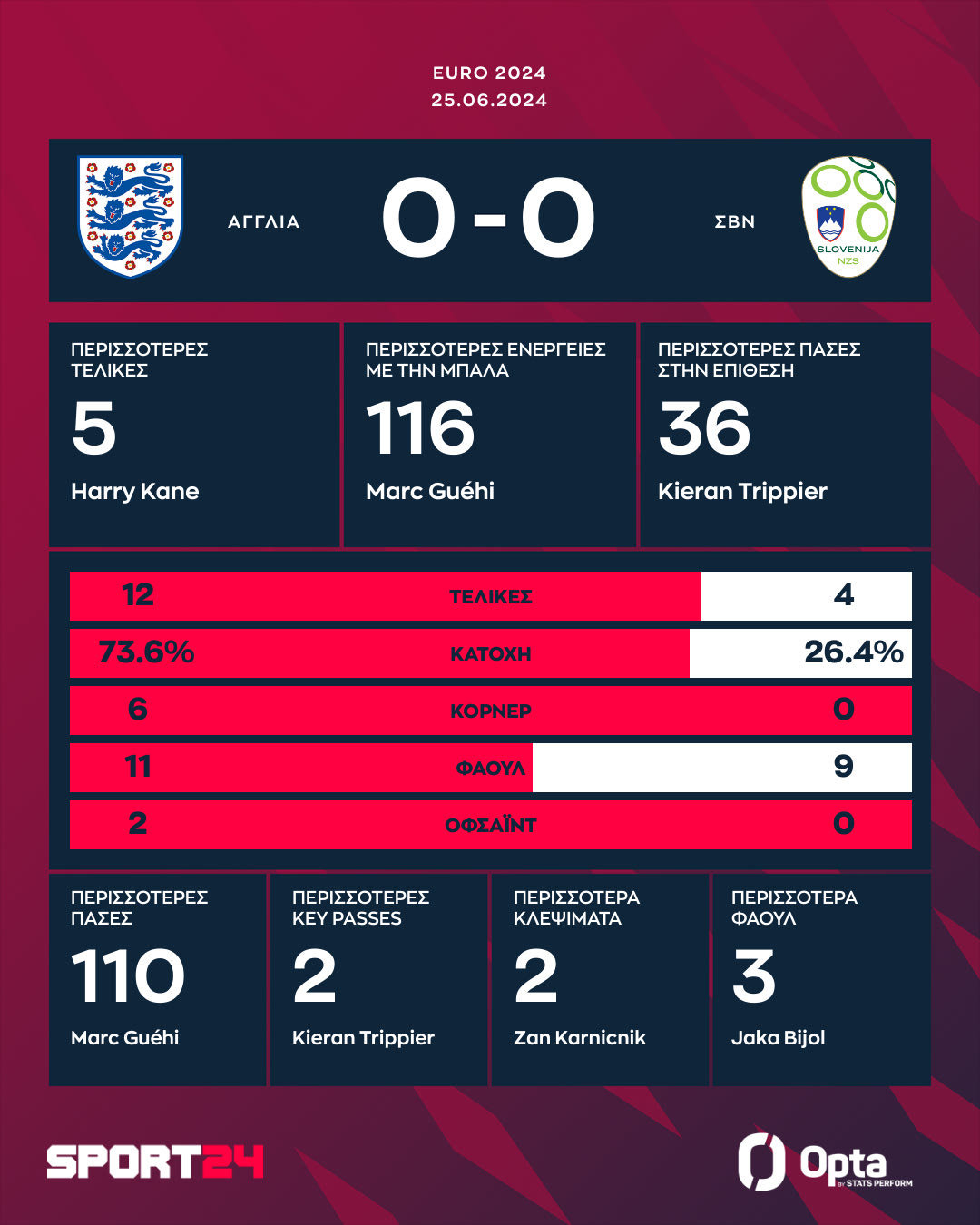 Ισόπαλο χωρίς τέρματα έληξε το παιχνίδι ανάμεσα στην Αγγλία και τη Σλοβενία με τα τρία λιοντάρια να προβληματίζουν ξανά με την απόδοση τους και την ομάδα των Σπόραρ, Τσέριν να παίρνει το χ που τους έδωσε την πρόκριση στους "16" του Euro 2024.