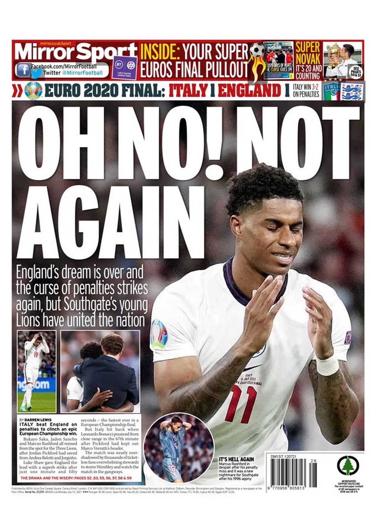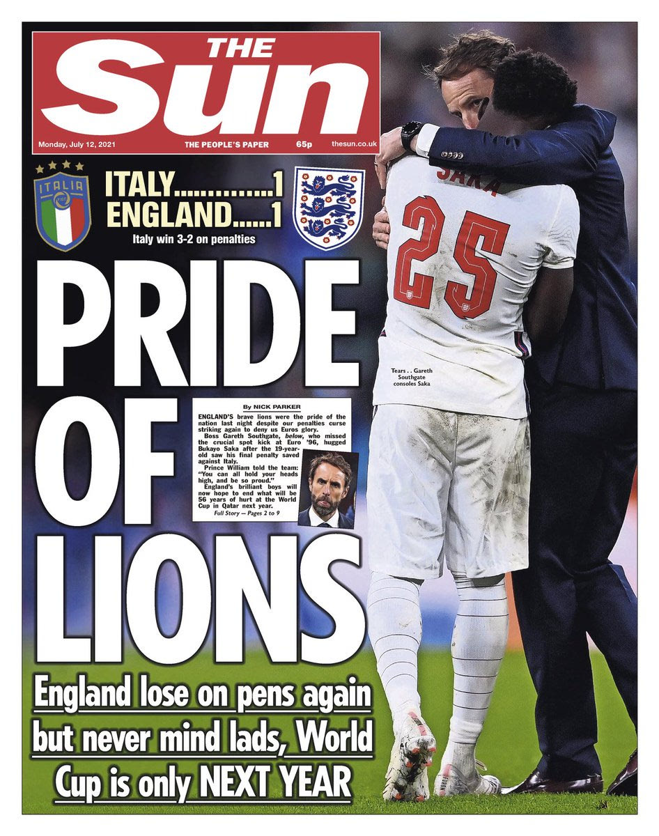 Τα πρωτοσέλιδα του αγγλικού Τύπου σχολίασαν την ήττα της χώρας τους στον τελικό του Euro 2020 απ' την Ιταλία και στάθηκαν κυρίως στην κατάρα της διαδικασίας των πέναλτι.