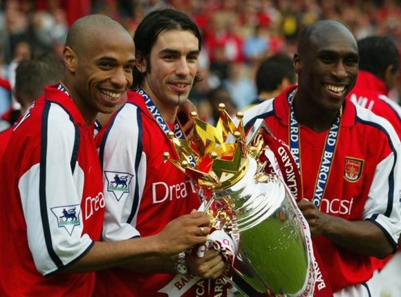 Ο Ανρί πανηγυρίζει μαζί με τους Πιρές και Κάμπελ το πρωτάθλημα του 2004