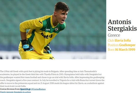 Ο "Guardian" επέλεξε το Sport24.gr για την ετήσια λίστα των κορυφαίων 17χρονων ποδοσφαιριστών του κόσμου και εμείς με τη σειρά μας τον τερματοφύλακα Αντώνη Στεργιάκη.