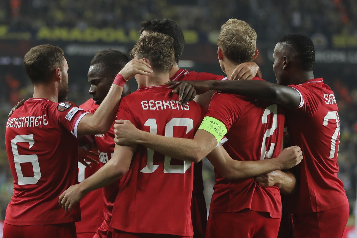 Οι παίκτες της Αντβέρπ πανηγυρίζουν γκολ που σημείωσαν κόντρα στη Φενέρ