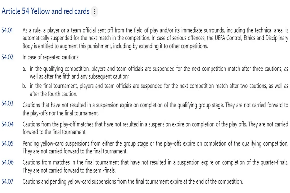 Ο κανονισμός της ΟΥΕΦΑ αναφέρει ότι ένας ποδοσφαιριστής που αγωνίζεται στα προκριματικά του Euro 2024 τιμωρείται με μία αγωνιστική, εφόσον συμπληρώσει τρεις κίτρινες κάρτες.