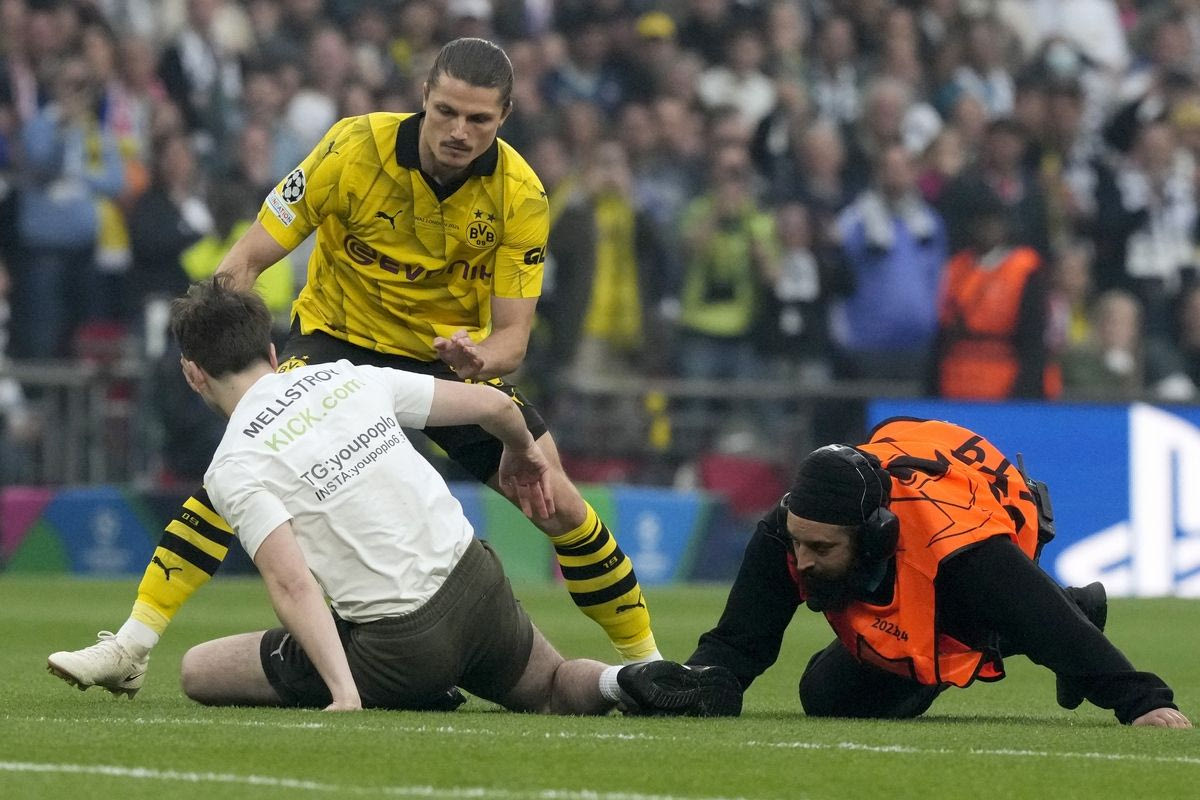 Ο τελικός του Champions League στο Γουέμπλεϊ μεταξύ της Ντόρτμουντ και της Ρεάλ διεκόπη μετά από 30 δευτερόλεπτα, καθώς οπαδοί εισέβαλαν στον αγωνιστικό χώρο.