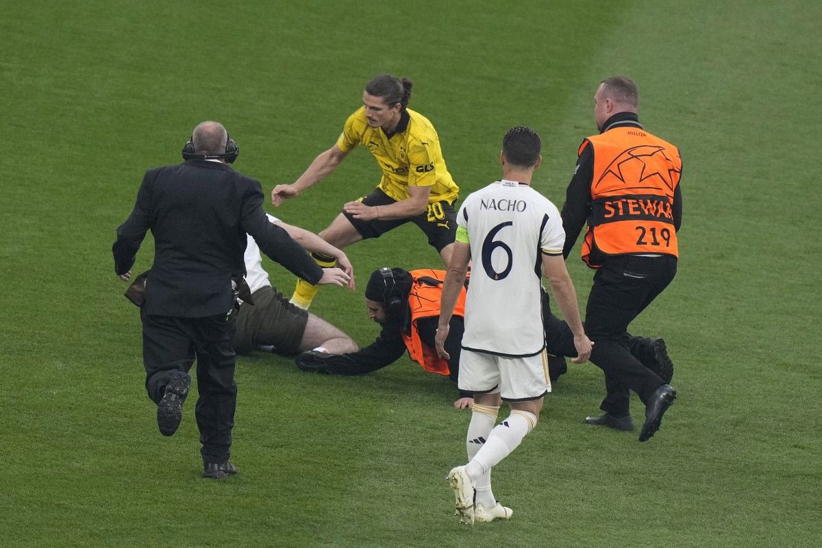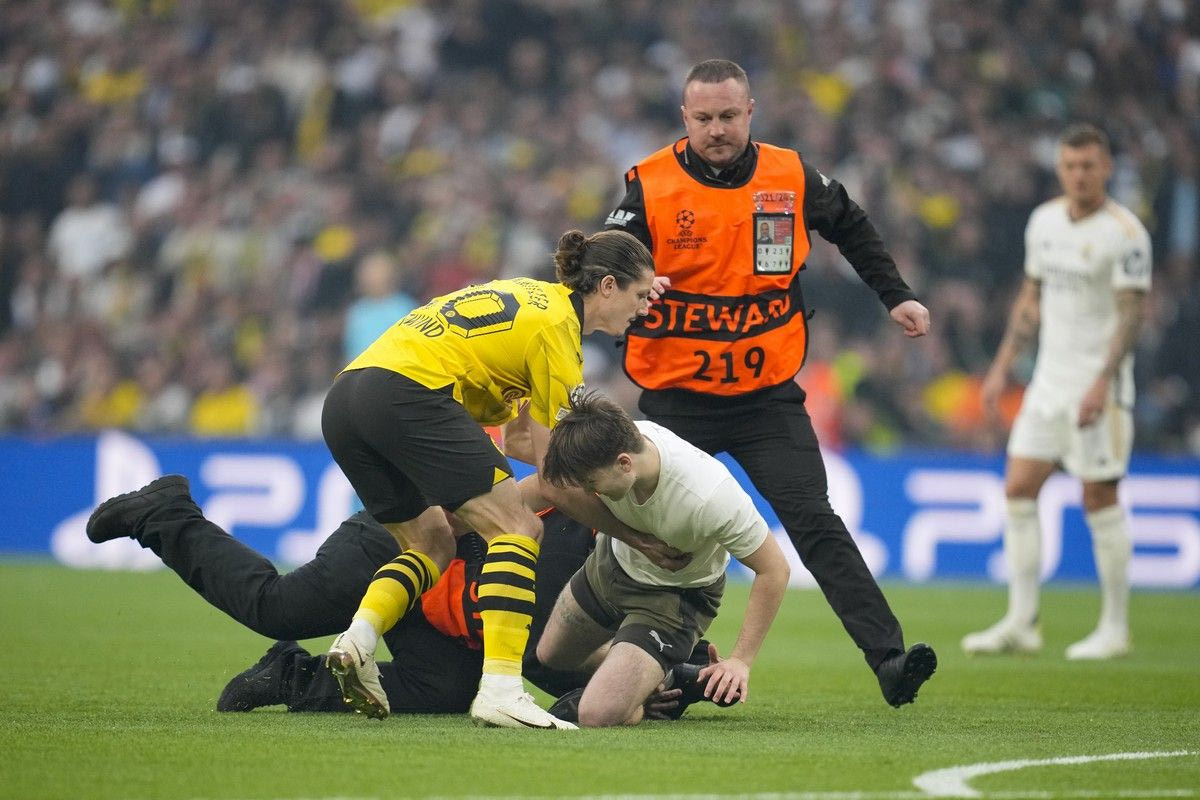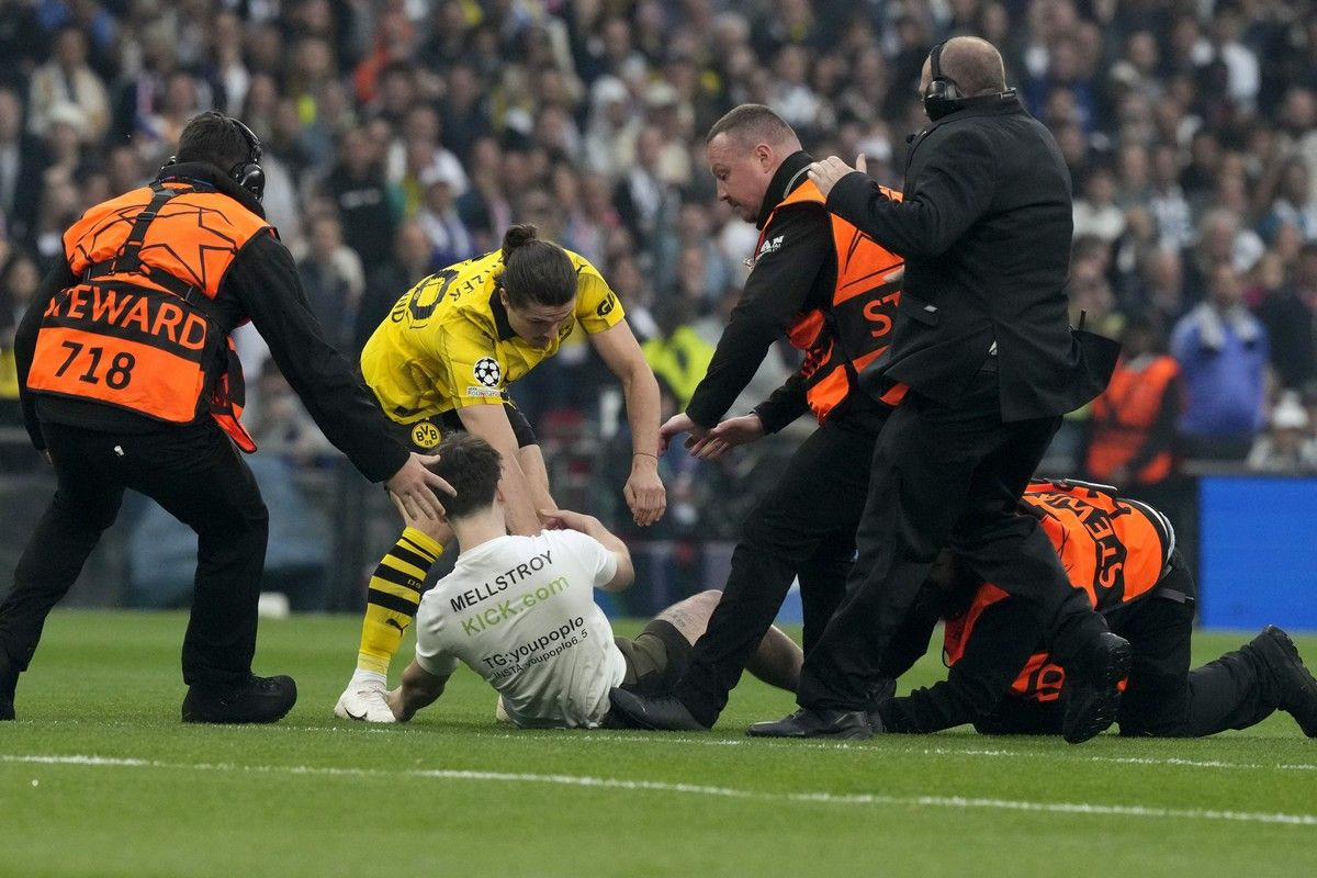 Dortmund's Marcel Sabitzer tries to hold up a pitch invader followed by security during the Champions League final soccer match between Borussia Dortmund and Real Madrid at Wembley stadium in London, Saturday, June 1, 2024. (AP Photo/Kin Cheung)